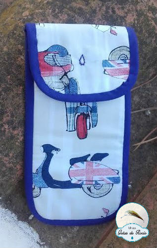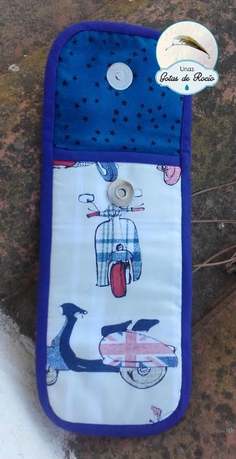 Y continuando con el tema gafas, esta tela me pareció perfecta para mi amigo Fernando cuando me pidió una funda de gafas. Motos, toque british y tonos azules. El cierre imán y mi gota, presente.