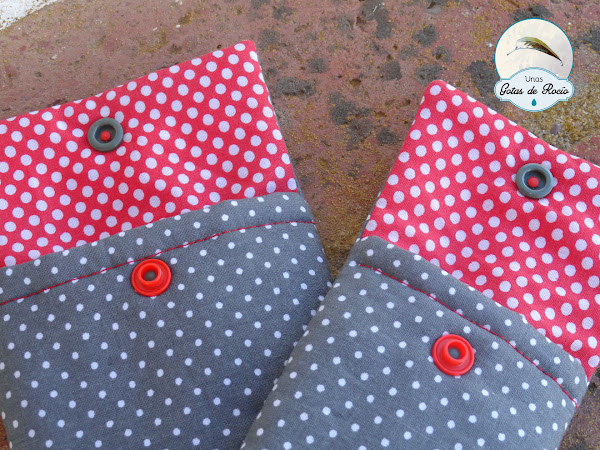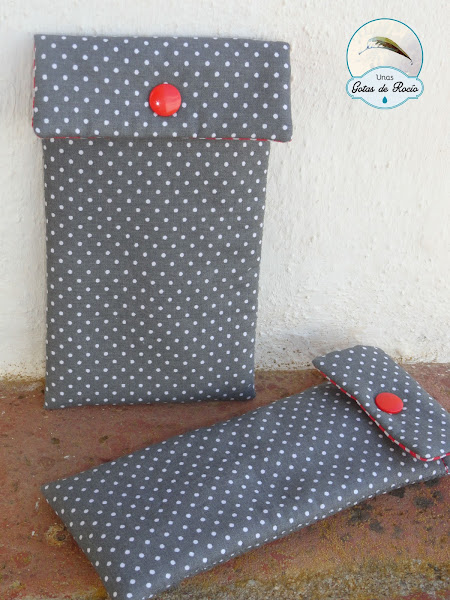 En esta ocasión la tela escogida fue una gris con lunaritos blancos, y con el snap en rojo ha quedado de lo más chic. Además de la funda para las gafas le hice otra para el móvil. Ella quería también guardar unas llaves y un monederito pequeño. No sé yo si le habrá cabido tanto, pero es que si lo hacía más grande al final el móvil iba a quedar bailando y no me convencía.