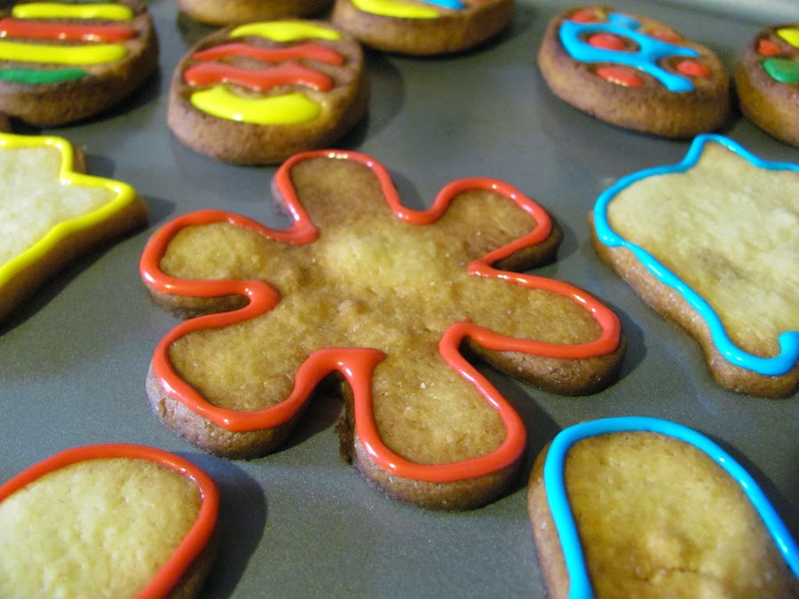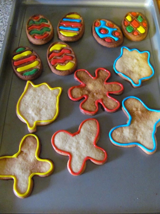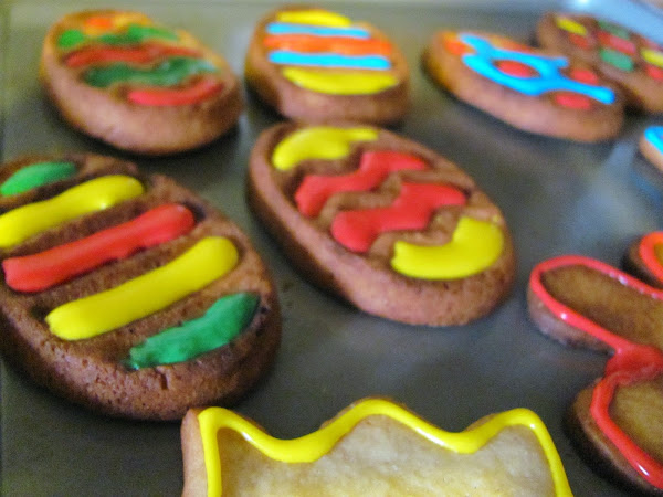 Saliendo del horno las galletas de pascua, habrá que esperar a que se enfrien por completo para poder decorarlas. En este caso, conseguí betún de glass que viene en tubitos, y es muy fácil de usar, lo único malo, es que solo venian 4 colores: rojo, amarillo, azul y verde (que por cierto ya venia un poco seco y fué complicado usarlo)....