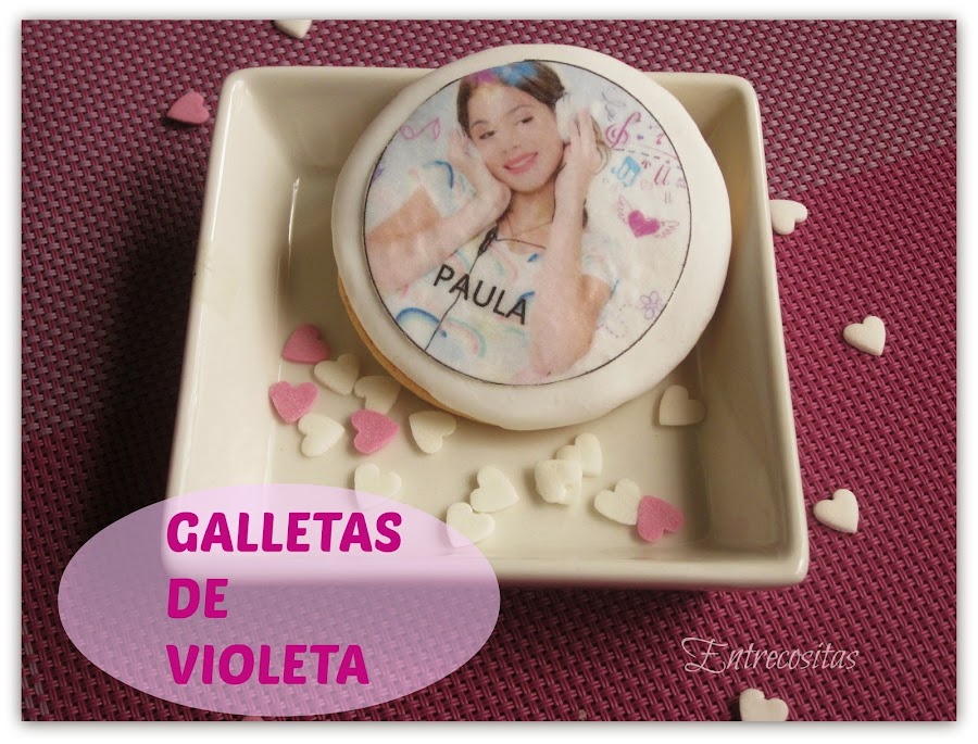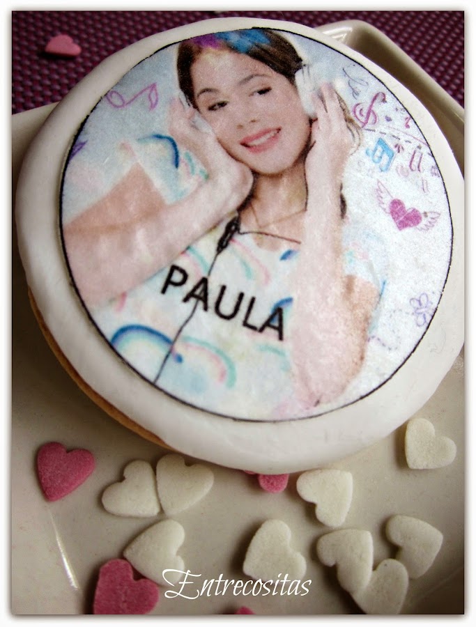 ¡Pues ya solo me faltaban las galletas!. Unas deliciosas galletas hechas con unas obleas decoradas con la imagen de Violetta y personalizadas con el nombre de Paula en este caso.