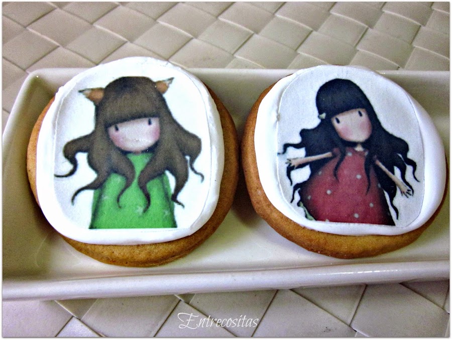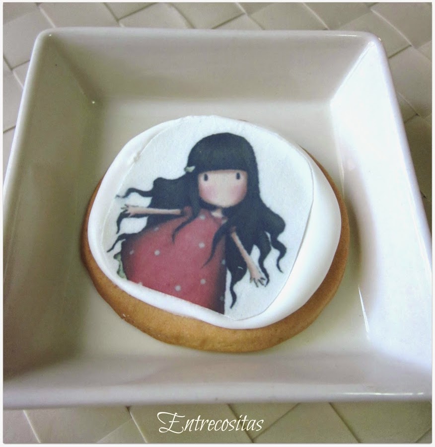 Las galletas están elaboradas con la receta básica, y luego se decoraron con glasa y con una oblea que estaba decorada con la muñequita.