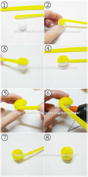 Paso 1. Cubrir la bola de porexpan con limpiapipas amarillo. Para cubrir las bolitas que serán los pollitos cogeremos limpiapipas amarillos e iremos rodeando cada una de las bolitas con ellos y pegándolos con silicona caliente hasta cubrir la bola de porexpan del todo tal y cómo podéis ver en las siguientes imágenes.