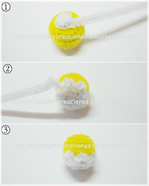 Para hacerlo empezamos por la parte inferior y cogemos un limpiapipas blanco y lo vamos enrollando desde la parte central inferior pegándolo con silicona caliente como si quisiéramos volver a envolver el pollito (imagen 1) y lo hacemos hasta una altura que nos parezca, nosotros hemos cubierto menos de la mitad de la bola, y en la última vuelta con el limpiapipas vamos realizando piquitos (imágenes 2 y 3) simulando la cáscara rota de los huevos.