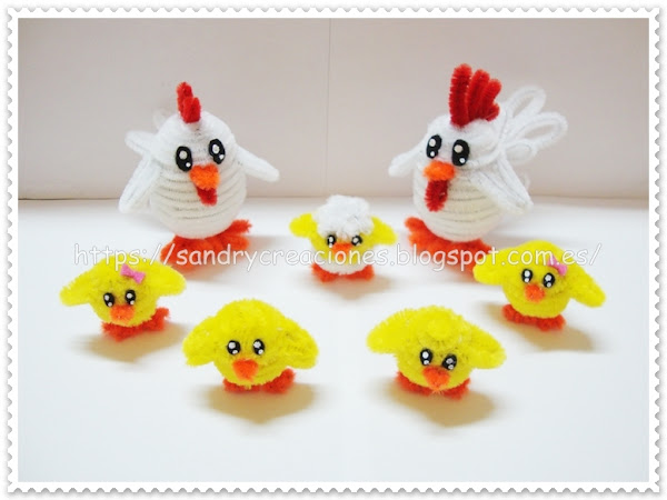 Estamos en plena Semana Santa y aquí estamos con una entrada muy adecuada para este tiempo. Os traemos unos simpáticos pollitos con su mama gallina y su papa gallo realizados con limpiapipas, bolas y huevos de porexpan.