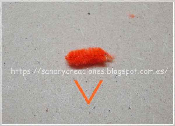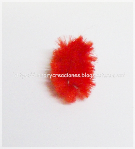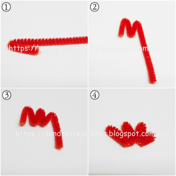 Paso 3. Realizar la cresta y el pico. Para realizar la cresta lo hacemos con un trozo de limpiapipas rojo de 7 cm aprox. con el que realizamos 3 piquitos tal como podéis ver en la imágenes siguientes: