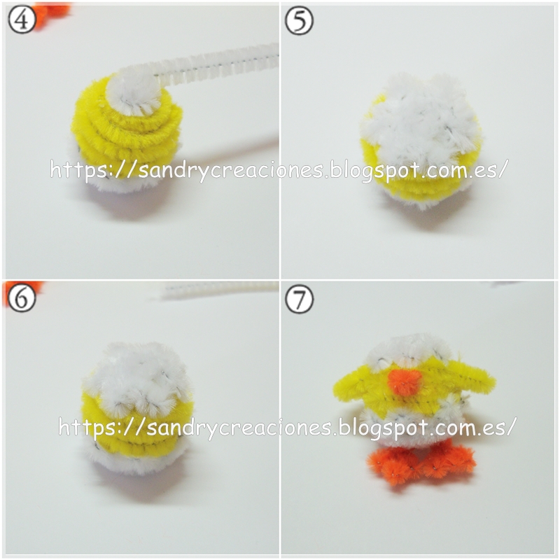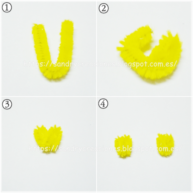 Para realizar las alas cogeremos un trozo de limpiapipas amarillo de 6 cm aprox. lo doblaremos por la mitad (imagen 1) y volveremos a doblar cada mitad por la mitad (imágenes 2 y 3). Una vez realizadas (imagen 4) las pegaremos a cada lado del cuerpo del pollito.