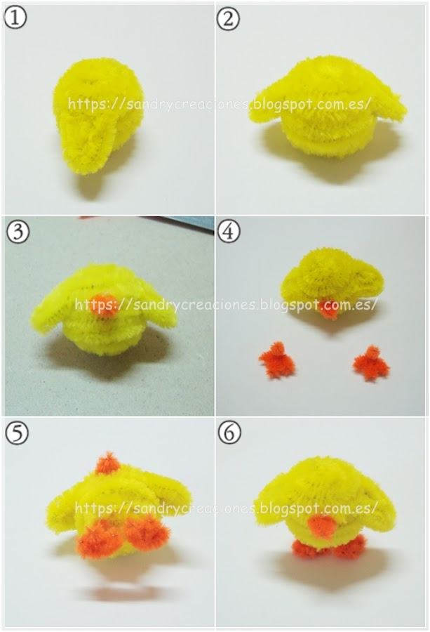 Una vez realizadas todas las partes de los pollitos sólo nos queda montarlos y pegarlos con silicona caliente. En las siguientes imágenes podéis ver más o menos el proceso de montaje que hemos seguido para hacer cada pollito: