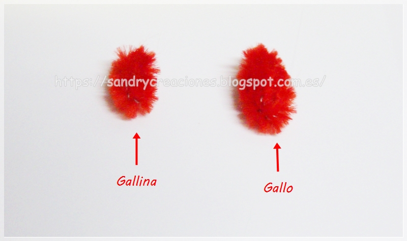 Y en el caso de la barbilla utilizamos un trozo de limpiapipas rojo de 5 cm aprox., a diferencia del de la gallina que era de 3 cm, y lo doblamos por la mitad. En la siguiente foto podéis ver la diferencia de las dos barbillas: