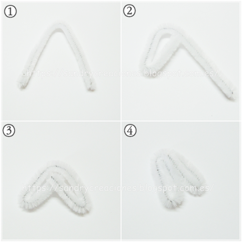 Para las alas cogemos un trozo de limpiapipas de 10 cm aprox., lo doblamos por la mitad (imagen 1), doblamos cada mitad por la mitad (imagen 2) y juntamos las dos mitades (imágenes 3 y 4):