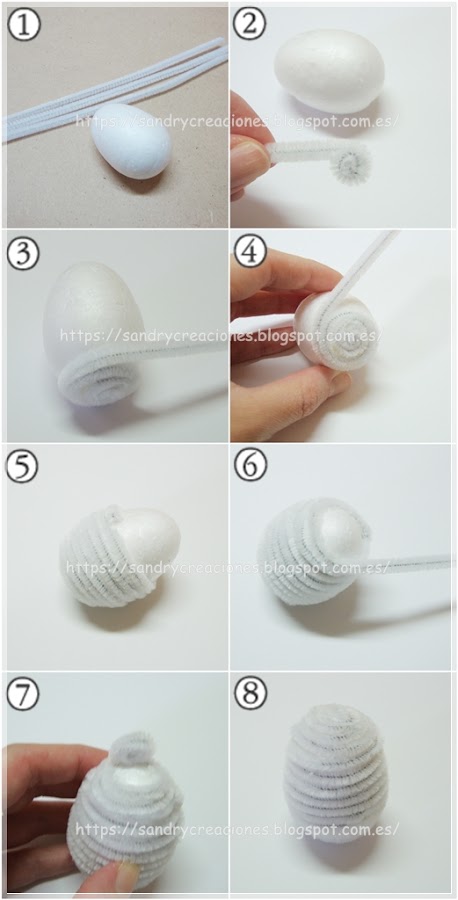 Paso 1. Cubrir un huevo de porexpan con limpiapipas blancos. Cogemos limpiapipas blancos y vamos envolviendo y cubriendo el huevo con ellos pegándolos con silicona caliente hasta que quede totalmente cubierto, de la misma forma que hicimos con los pollitos.