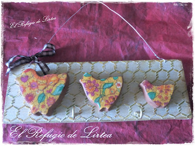 Pegó mis tres gallinas sobre la tablilla, puse dos pequeñas perchas y ya tengo mi colgador rustico.