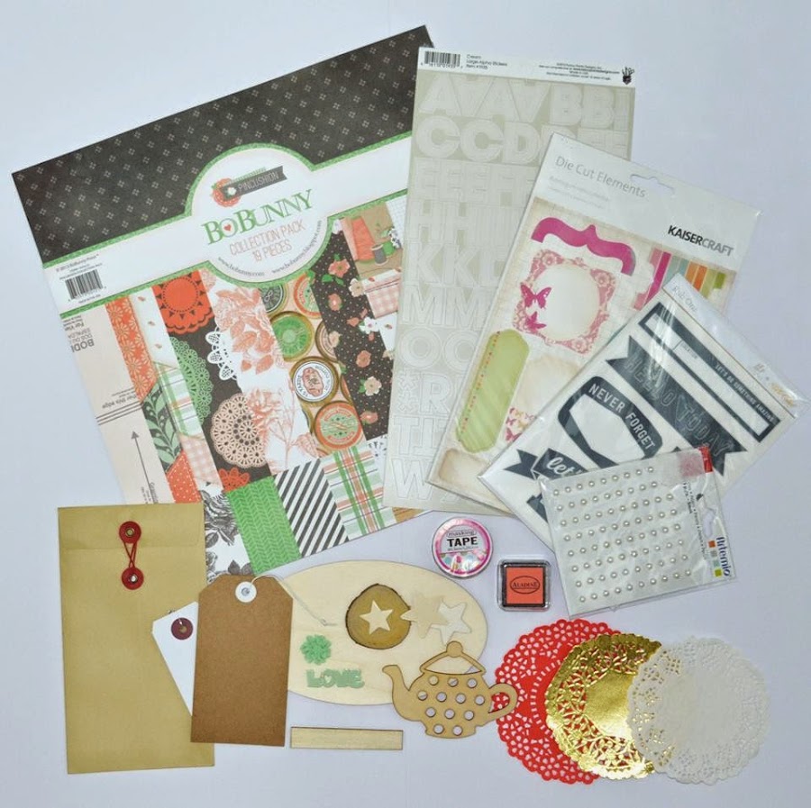 8) Pack para hacer Scrapbooking de la artesana y bloguera Esther de PORCION DE SCRAP (9 papeles de la colección pincushion de bobunny,die cuts elements de kaisercraft ,ABC cream de fancy pants,rubons de studio calico ,perlas adhesivas de artemio,tinta coral aladine,1 sobre craft,2 tags,1 masking tape,3 blondas , un cartelito ovalado de madera y adornos varios),para Ruca, la casa de los complementos