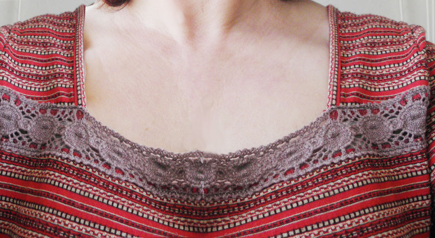 ¡Me encanta el ganchillo!. No para hacer cosas enormes que me eternizo con ellas sino para arreglos rápidos como el del vestido o como lo de esta camiseta.