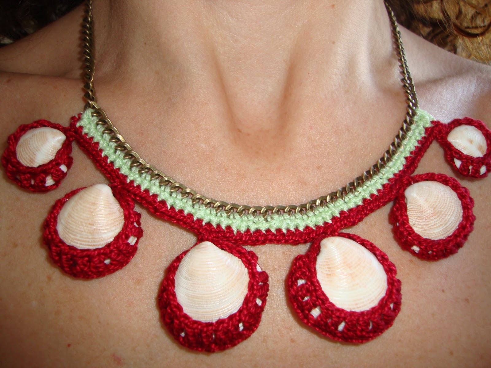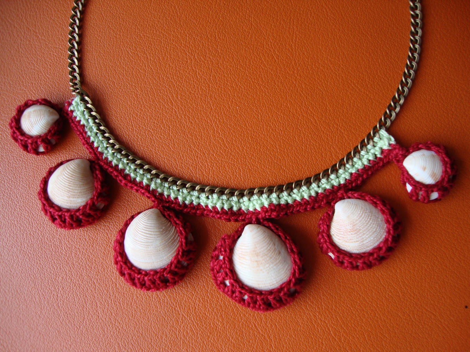 Las combiné con un trozo de cadena en ocre (de la que se compra por metros) y dos hilos de crochet nº 8 en rojo y verde.