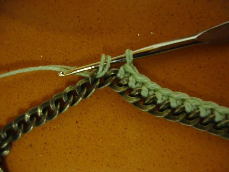 Después pasamos a trabajar sobre la cadena que habremos cortado del largo necesario para formar la gargantilla. Medimos el espacio que vamos a ocupar con la distribución de las conchas y lo calculamos bien centrado en la cadena para comenzar a tejer con el ganchillo sobre ella, con el crochet verde , una primera fila de puntos bajos: