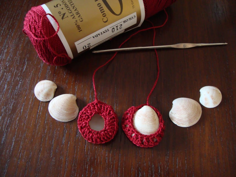 Estas están cubiertas en sentido contrario a las del colgante de la entrada previa, o sea, empezando por la parte hueca de la concha y terminando por arriba. Comenzamos haciendo una circunferencia para la base con el nº de cadenetas ajustado al tamaño de la concha de modo que calculemos que una 2ª fila de puntos altos nos va a cubrir toda la circunferencia de la concha (como se ve en la foto).