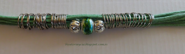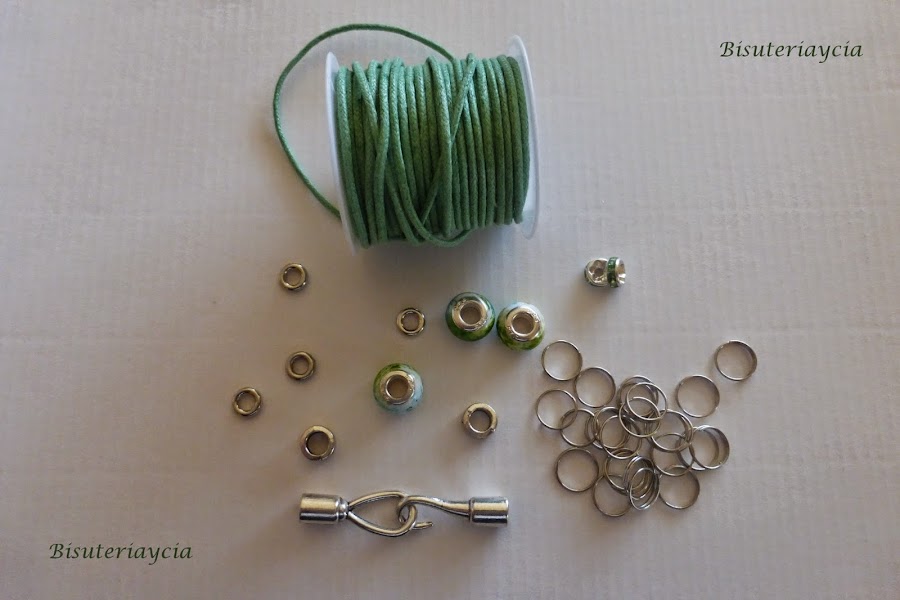 Los materiales que vamos a utilizar son los siguientes: cordón encerado del color que mas os guste, diferentes tipos de abalorios, anillas y cierre.