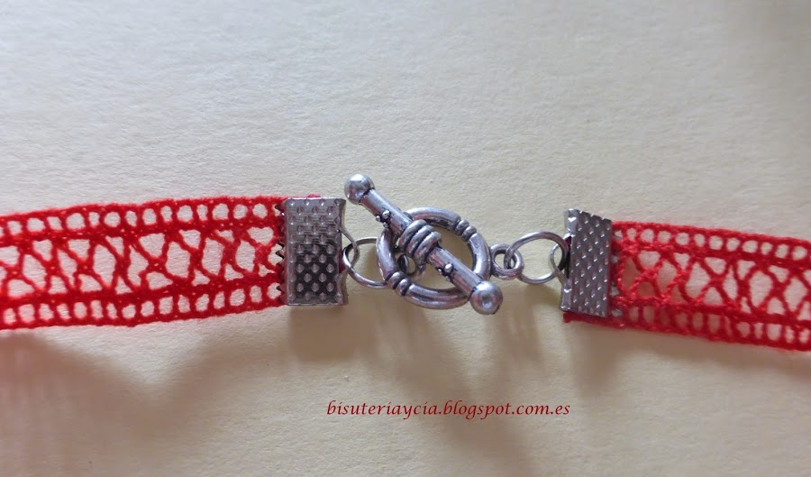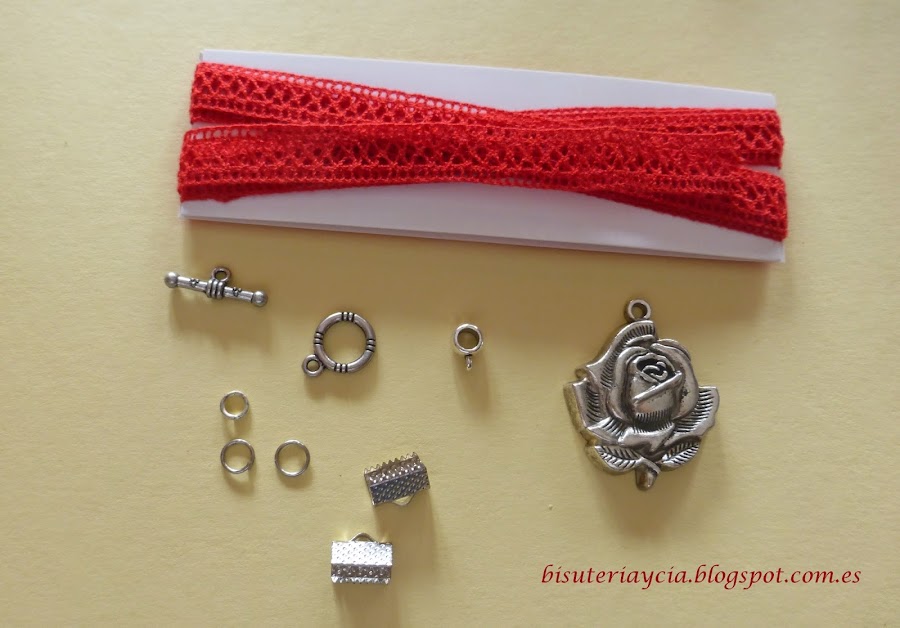 Cinta de encaje, un colgador, un colgante, anillas, terminales planos y un cierre.