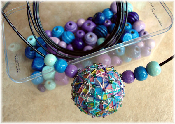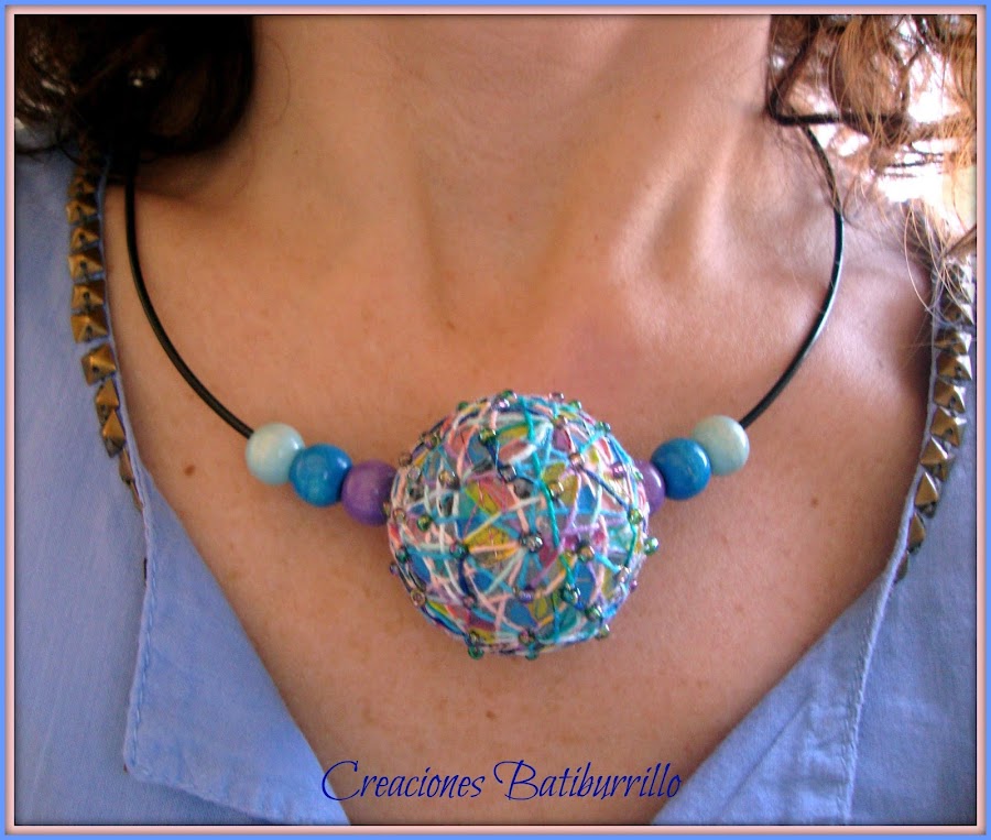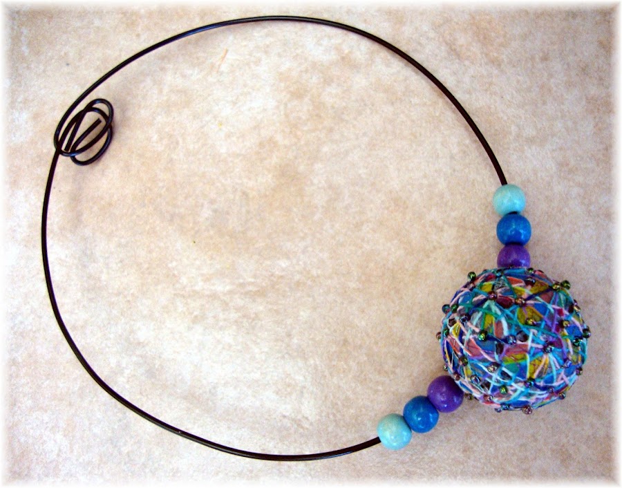 Como casi siempre hago colgantes, esta vez pensé en una gargantilla, una especie de planetario con unos abalorios en madera más pequeños sobre una base de alambre de bisutería grueso que pudiera introducir por dentro de lado a lado aprovechando dos agujeros de los que ya tenía (si vais a usar un cordón, lo metéis antes de llenar toda la esfera de hilos, que luego es mucho más complicado).