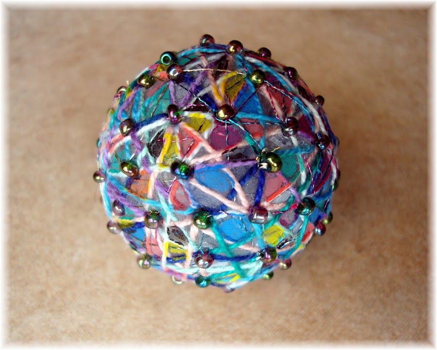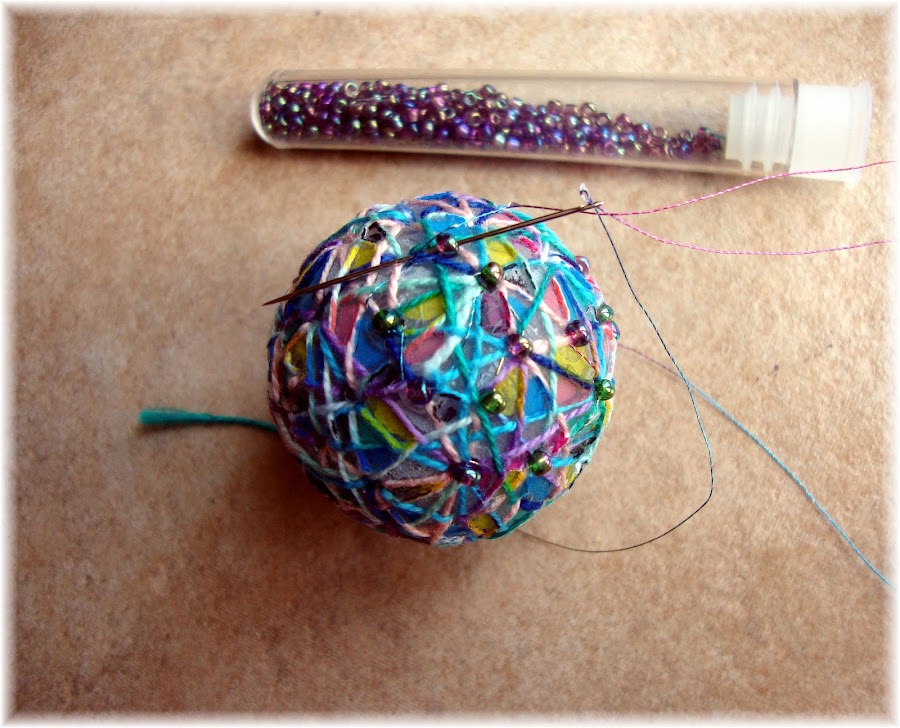 Por último, con abalorios pequeños rellené cada hueco, la aguja esta vez está enhebrada con un hilo fino brillante multicolor que voy atravesando por la superficie, en el entramado con los otros, para pasar por todos los agujeros y completar la red.