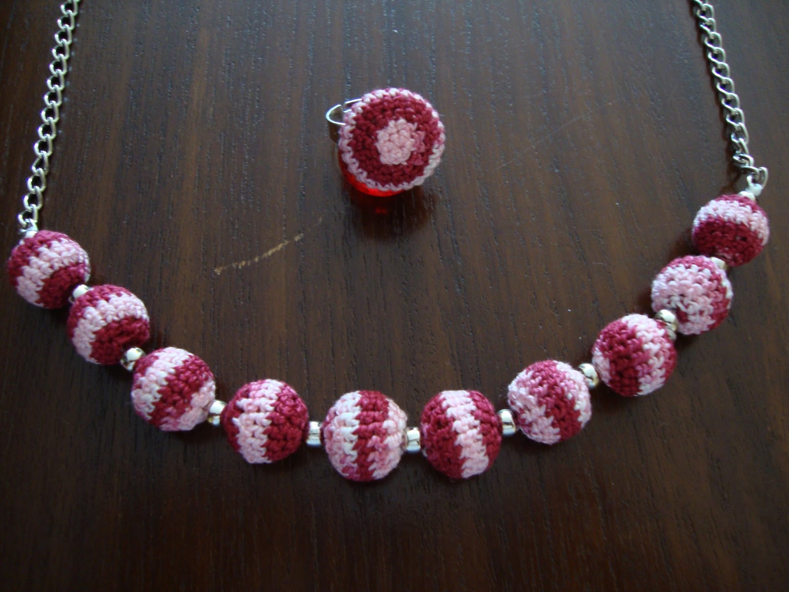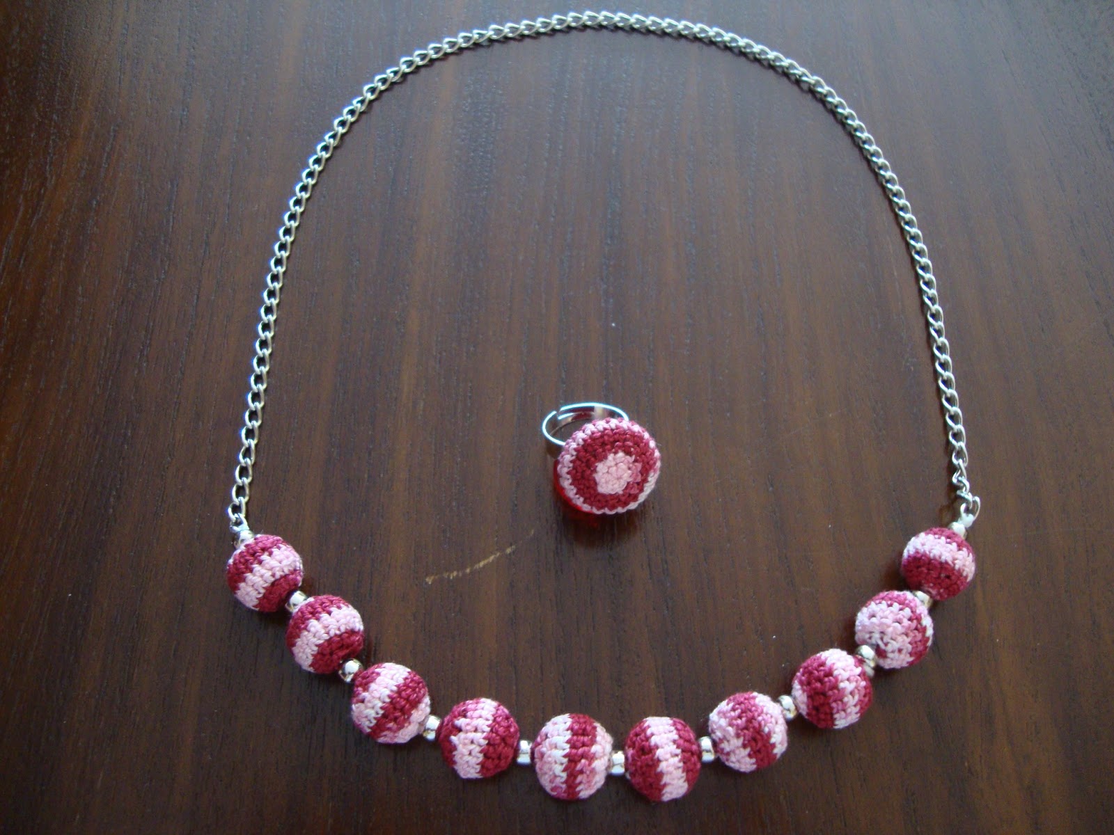 Para la gargantilla fui forrando abalorios redondos de madera siguiendo el mismo tutorial de puntos que ya os mostré en la entrada del otro collar plateado. Al hacerlos con un hilo de crochet matizado las esferas salen ralladas. A la hora de distribuirlas las fui combinando con abalorios plateados más pequeños y teniendo en cuenta los colores para que no coincidieran dos seguidos (respetando la alternancia de los tonos).