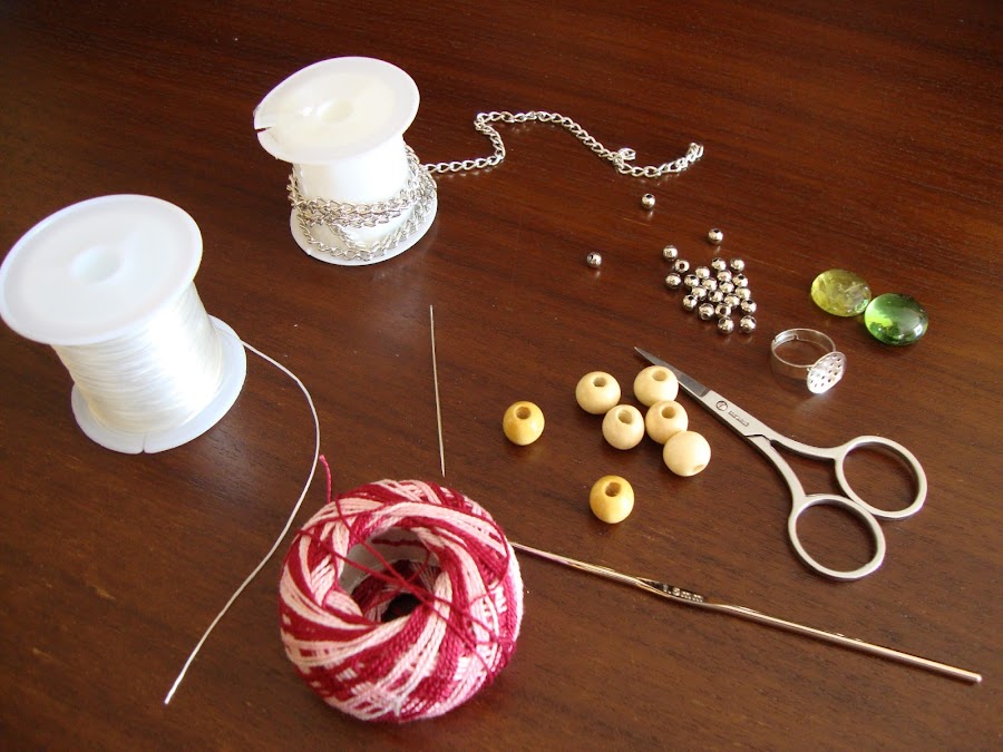 Se puede hacer toda la gargantilla de bolas o solo a modo de colgante y la otra mitad de cadena como en mi caso. Podemos encontrar cadenas de diferentes grosores y formas en tiendas especializadas que se venden por metros o incluso en bazares. Para no tener que poner broche lo que hice fue enhebrar las bolas sobre un cordón elástico que me permite un margen de estiramiento de la gargantilla para ponerla.