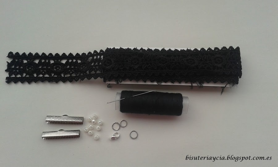 Los materiales que utilizaremos son los siguientes: cinta de encaja, perlas pequeñas, terminales planos, anillas, cierre, hilo y una aguja de coser.