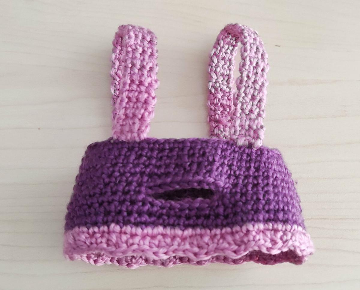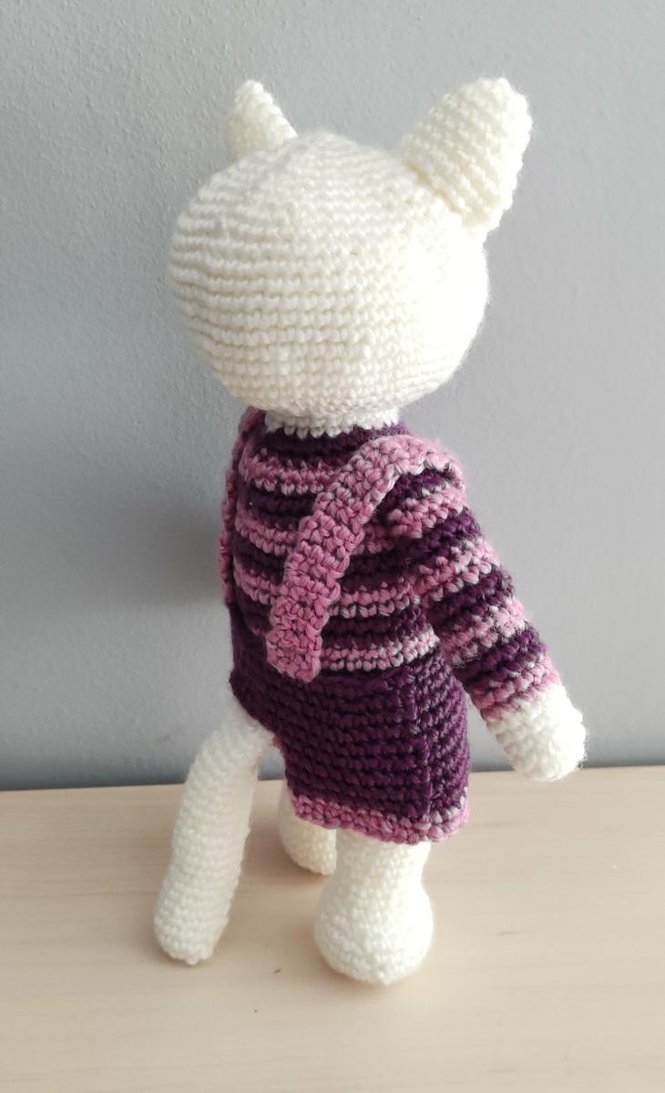 En vez del patalón que lleva en el patrón original, le he hecho una falda a la gatita amigurumi. Para ello he seguido las indicaciones paso a paso del patalón hasta la medida que he querido darle, dejandole la abertura en la parte trasera como indica para poder pasar la cola. En total han sido 9 vueltas en lila y una puntillita de color rosa con una vuelta de puntos bajos y otra vuelta combinando 2puntos bajos, 2 puntos altos. Por último los tirantes.