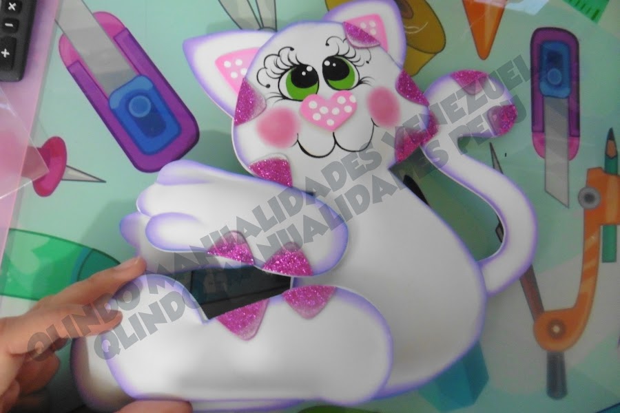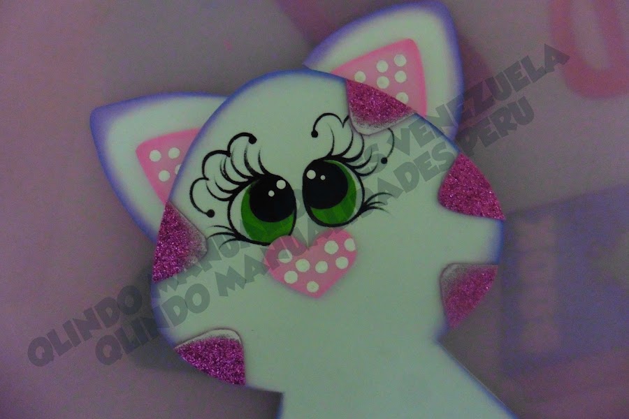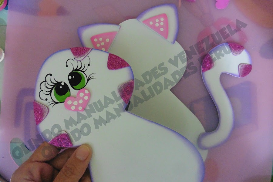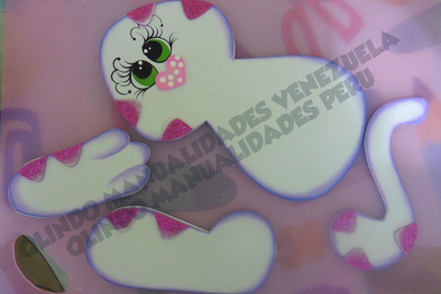 13. Para armar la gatita vamos a cortar las piezas en microporoso color blanco como lo indica el patrón, observa la foto de abajo como sombree las piezas con pintura acrílica lila.