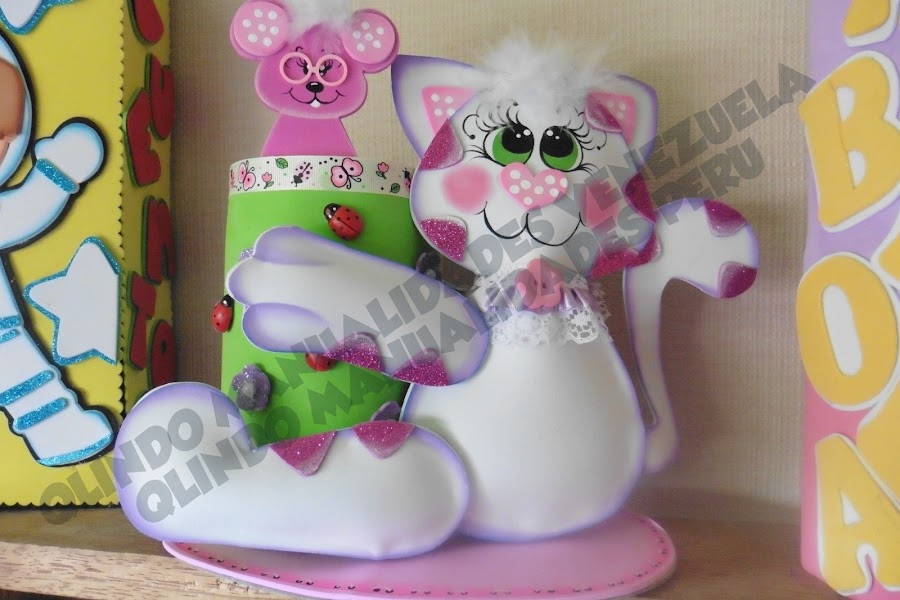 25. Mira que lindo quedo nuestro proyecto, con el marabú le hice unos flequillos a la gatita y el ratoncito y a este último le pegue unos lentes plásticos, así mismo a la gatita le pegue en su cuello una cinta bordada lila y un botón, son detallitos que pueden variar según tu gusto.