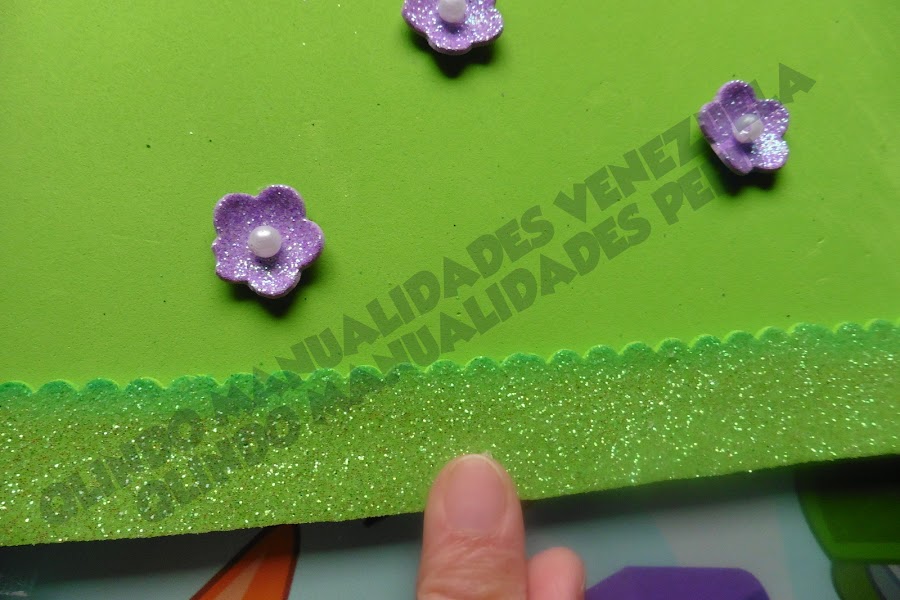 10. En la parte inferior del microporoso vamos a pegar una tira de microporoso escarchado verde limón, imitando grama.