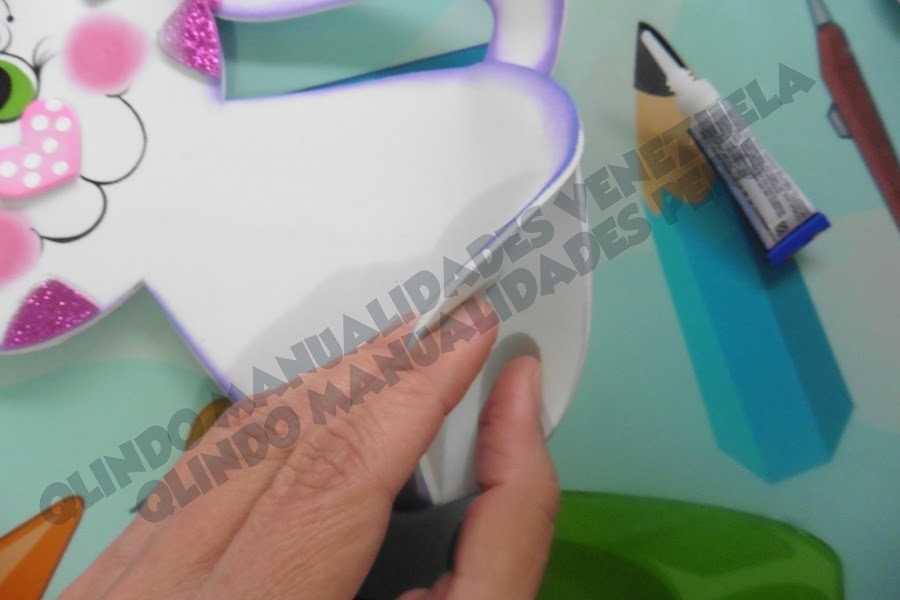 19. Antes de pegar las dos piezas que componen el cuerpo observa la foto de abajo y fijate como yo he pegado las orejas y la cola en la base de abajo esto es para que al momento de cerrarla las mismas queden por dentro.