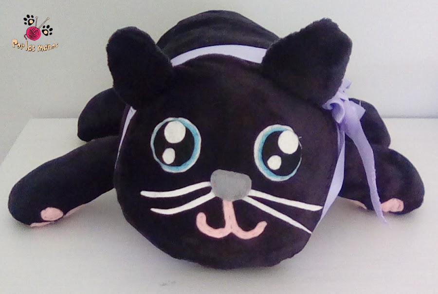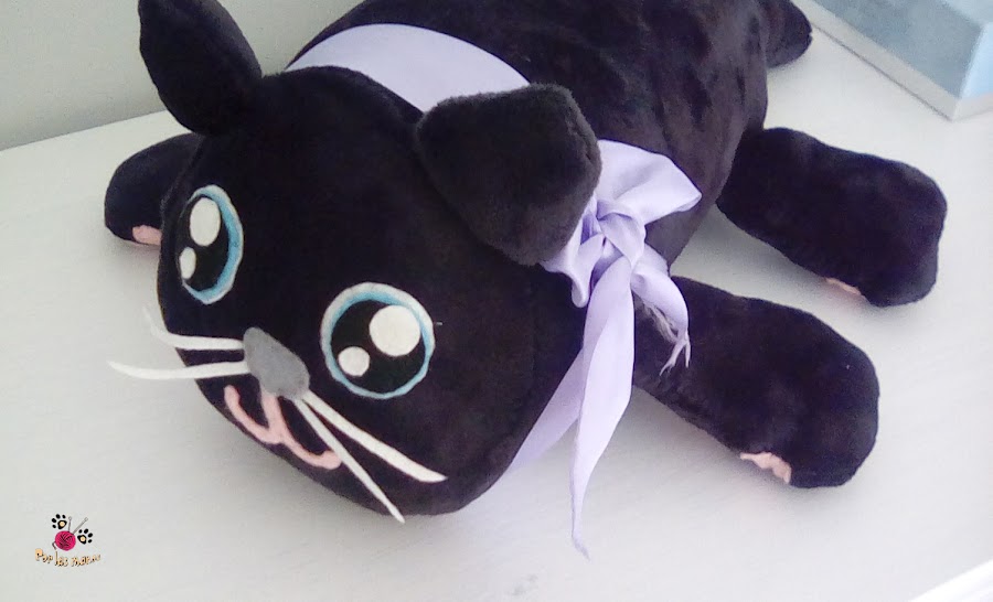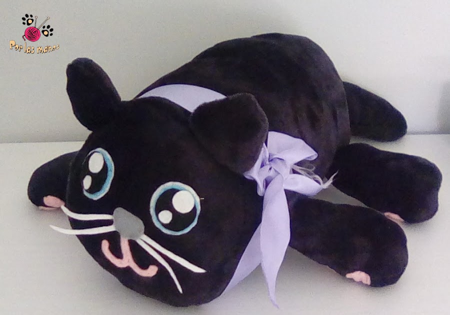 Como veis es un gato negro de peluche, muy muy suavito (he sabido elegir la tela correcta, aunque me he matado cosiéndola) y bastante achuchable (al menos esa era la palabras que todos los que han visto el gatito han dicho). Es grande, de unos 50cm de largo, y un poco menos de ancho. En realidad lo he hecho a ojo, porque pensaba que sería mas facil...pero no, lo he cosido y descosido tres mil veces. Los detalles están hechos de fieltro.