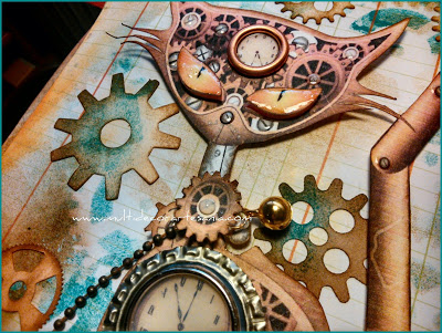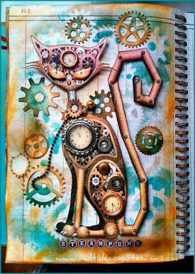 En una página de mi Smash Book he creado, con tintas distress y algunos engranajes troquelados, un fondo en unos tonos que me encantan, además los veía muy apropiados para este estilo tan peculiar.