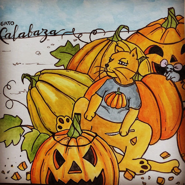 Gato 31: Calabaza. La que faltaba, tenía que convertir un gato en calabaza, eso hubiera sido una salida fácil pero mejor usé el tema para poner al gato divirtiéndose con su amigo