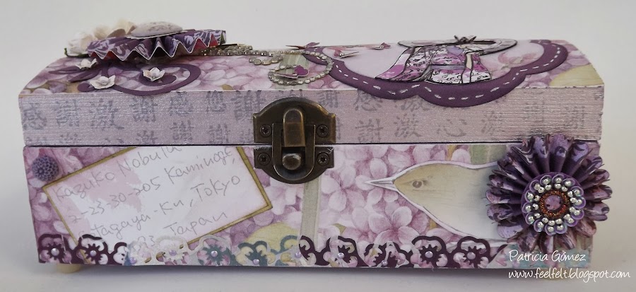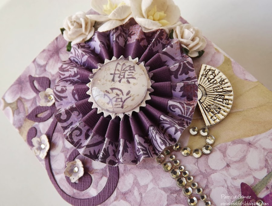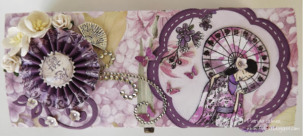 En el centro de la tapa, la Geisha y flores son de Kanban -Oriental Lady- Serenity. Está dentro de unos marcos que son Spellbinders Nestabilities Blossoms II.
