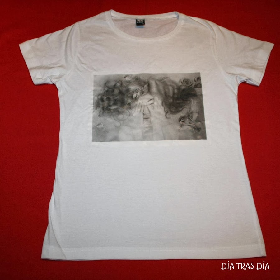 Pero mi sobrina Rosa es muy exigente consigo misma y muy perfeccionistay no le gustó cómo había quedado su dibujo por lo que decidió que como era suyo podía hacer con él lo que quisiera y optó por tirarlo a la basura. Cuando su madre descubrió que se había quedado sin el dibujo que tanto le gustaba por los recuerdos que le traía, pensó la idea de hacerse una camiseta con el dibujo, ya que al menos habían quedado de él algunas fotografías del proceso y del resultado final.