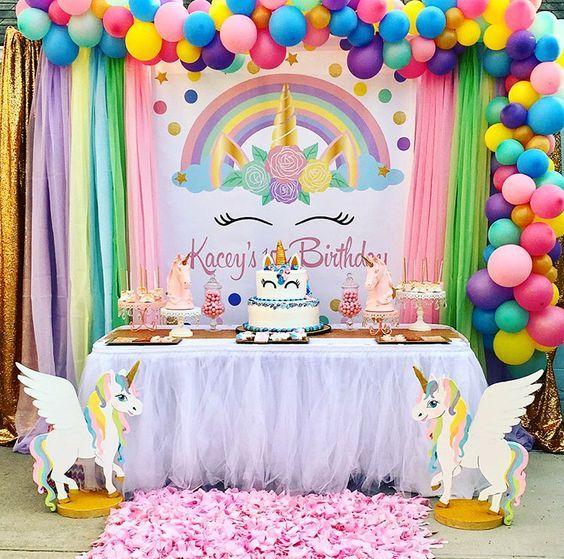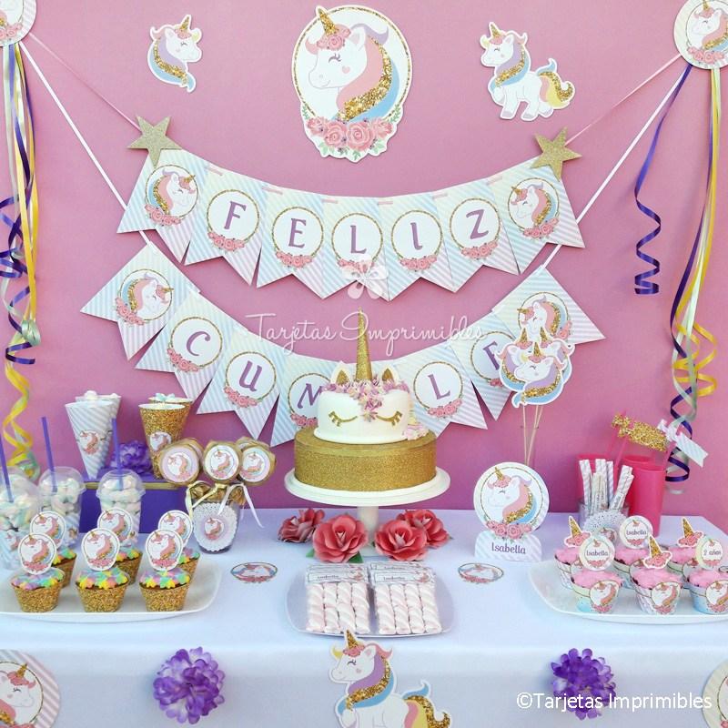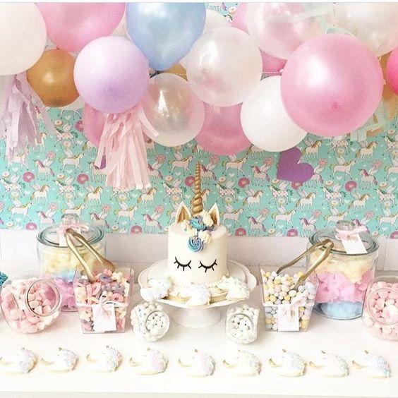 La temática de Unicornios es una de las preferidas entre las niñas, y no sólo niñas, también las quinceañeras y jóvenes han adoptado este tema para sus fiestas de cumpleaños. Y no es para menos, es muy romántico y femenino, ocupa los colores del arco iris, ya sea en tonos pasteles o más estridentes, el dorado y blanco principalmente.