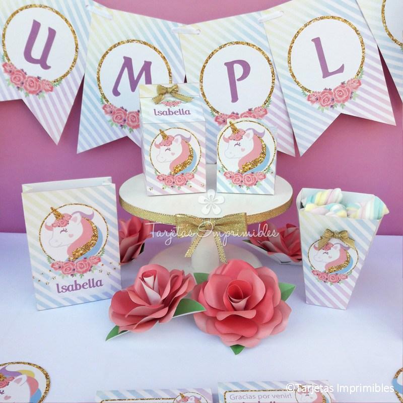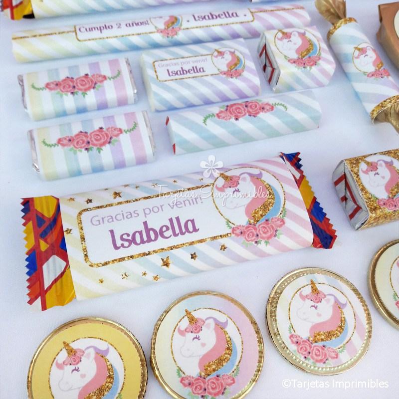Hace un tiempo diseñé una hermosa temática de Unicornios para fiestas, que te va a facilitar la tarea de organizar las decoraciones y candy bar, ya que contiene muchos archivos imprimibles con etiquetas para golosinas, botellitas, banderines, centros de mesa, cajitas e invitaciones, listas para que edites los textos e imprimas la cantidad que necesites…. Puedes ver más detalles e info acerca de los kits imprimibles de Unicornios aquí.