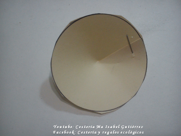 Encimamos el corte que hicimos y grapamos; si no tienes grapadora puedes poner pegamento y una pinza y esperar a que seque bien. El propósito es hacer una especia de pequeño cono...