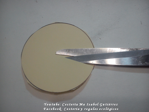 Aparte, cortamos una rueda de cartón flexible, del tipo de carpetas de archivo o de cajas de cereal, de tamaño pequeño, ya que los pétalos van a ir pegados sobre esta rueda, y hacemos un corte empezando por un lado hasta casi llegar al centro...