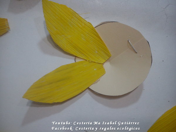 En base a los moldes, cortamos los pétalos de las hojas de maíz o choclo, considerando que cada flor lleva entre 15 y 17 pétalos...