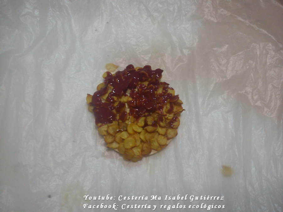 Aparte, cortamos otra rueda mas pequeña de cartón, ésta será el centro del girasol. Como sabemos, el centro de los girasoles tienen una textura rugosa, la vamos a imitar pegando en la rueda de cartón las semillas que traen algunos chiles o ajíes...