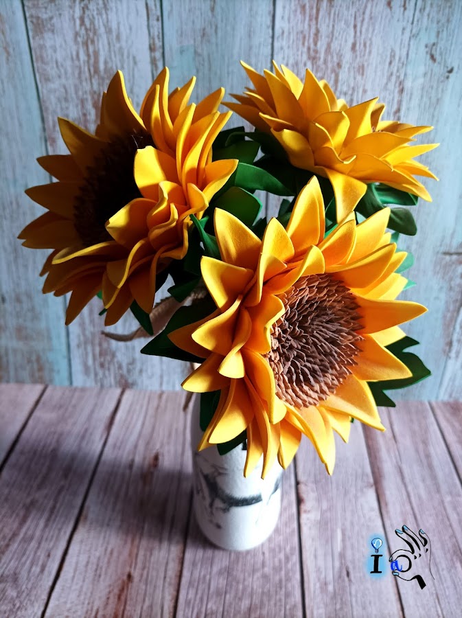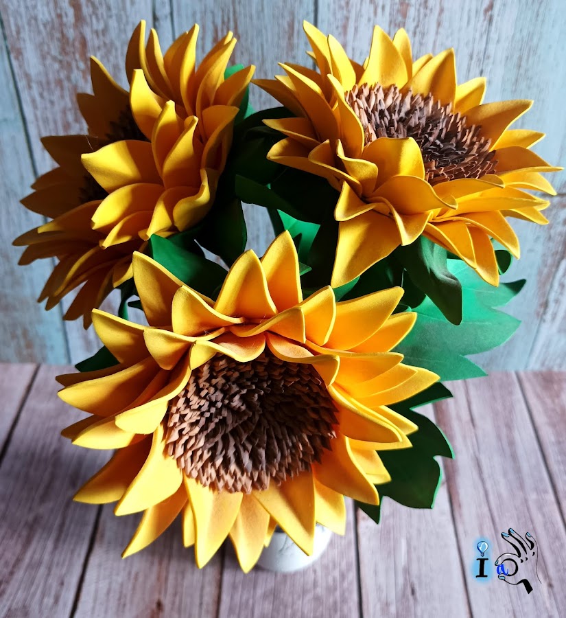 Estos girasoles los hice a partir de este post suyo en el que explicaba cómo hacerlos, pero es que además cuando los estaba haciendo me ayudó mucho, mandandome whatsapp e indicaciones de cómo hacerlos. Recuerdo esos días en que yo le mandaba fotos o mini vídeos y ella me decía que era mejor hacerlos de una manera o de otra...