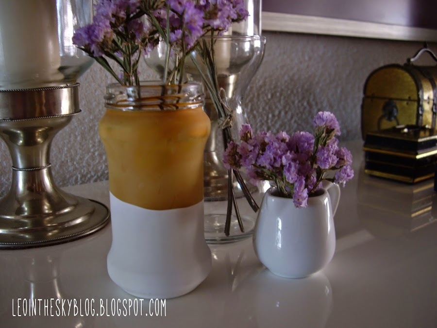 Siempre queda mejor disponer los objetos en distintas alturas, por supuesto los más pequeños delante y algo que suele funcionar siempre es formar grupitos de tres, como en este caso que en vez de colocar las flores en un solo jarrón he preferido utilizar tres pequeños: por un lado una pequeña jarrita para la leche que ya habéis visto en otros post, un recipiente de cristal que sirve para colocar bulbos de jacinto en su parte más ancha y un tarro de cristal reciclado al que he vestido un poco con un par de globos. La idea no es mía, hace tiempo que lo vi en algún blog americano que ya no recuerdo, y en este post de Oro y Menta. El truco está en inflar el globo para darlo un poco de sí y después cortar la parte estrecha del mismo, luego es bastante fácil ir forrando el frasco.