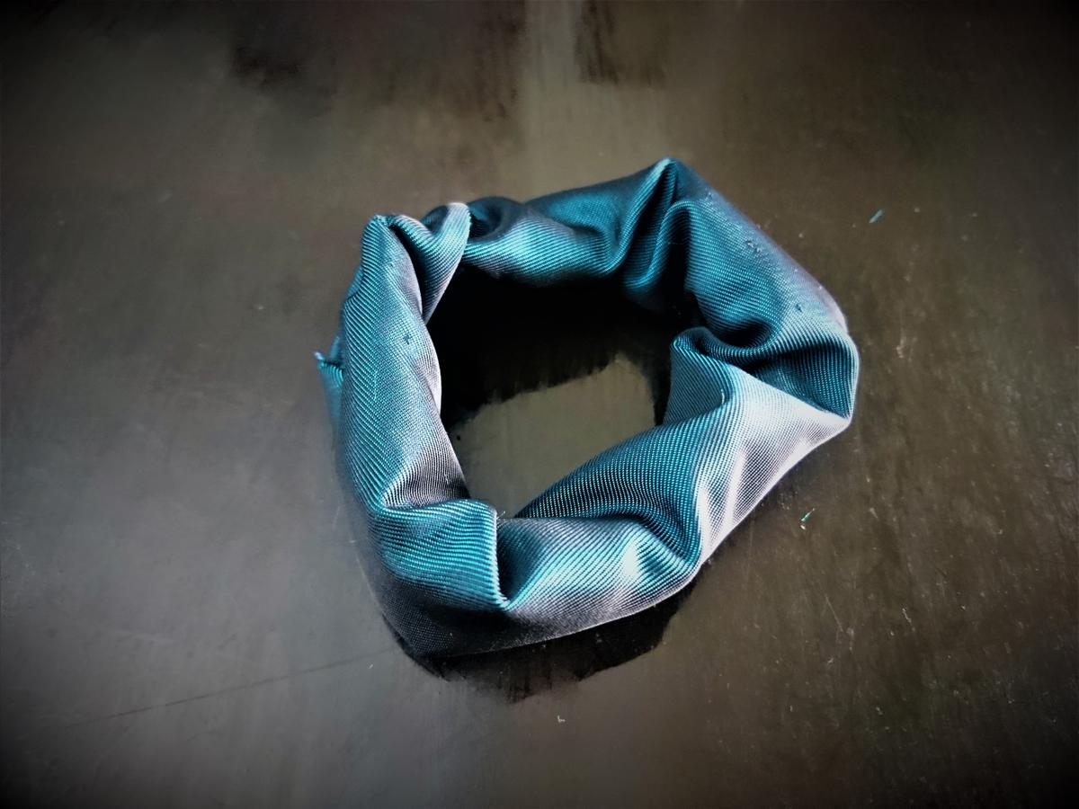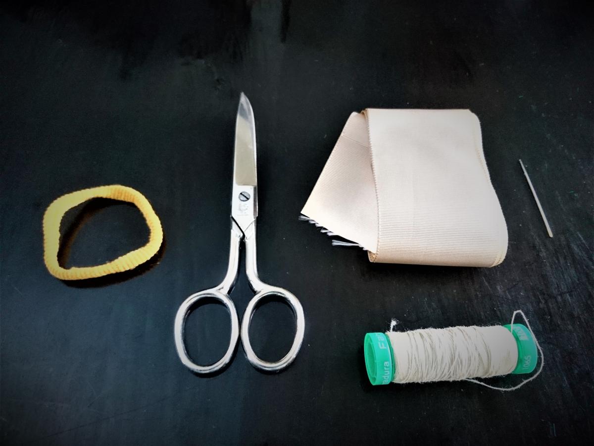 Dobladillo de tela. Dentro de él, vamos a pasar la goma elástica y con ayuda del imperdible, sujetaremos dos extremos de ésta y los coseremos.