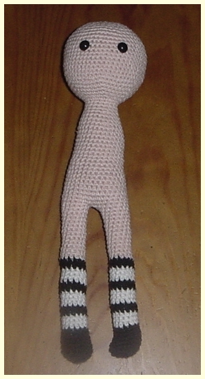 Vamos a hacer la muñeca de una sola pieza, excepto los brazos y la ropa que se hacen aparte comenzaremos por las piernas y seguiremos hasta cerrar la cabeza.