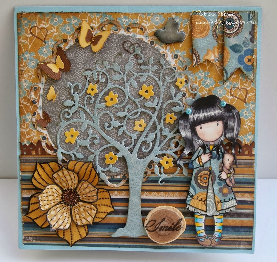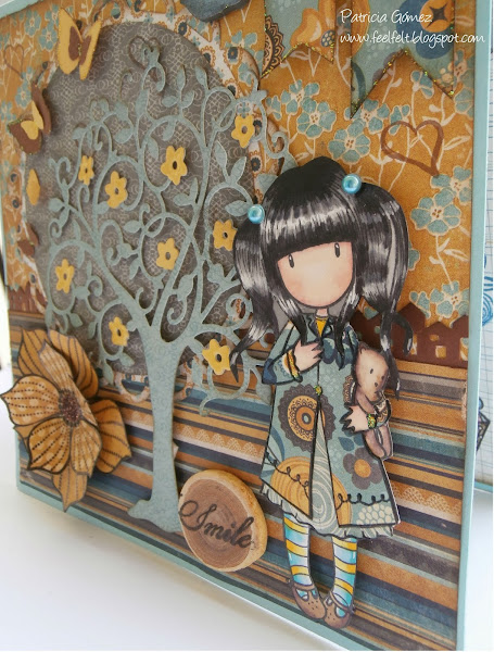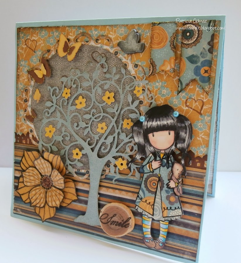 La protagonista es Gorjuss The Lost Heart, que no la usaba desde esta tarjeta, está coloreada con promarkers y vestida de "Desigual" mediante paper piecing :)