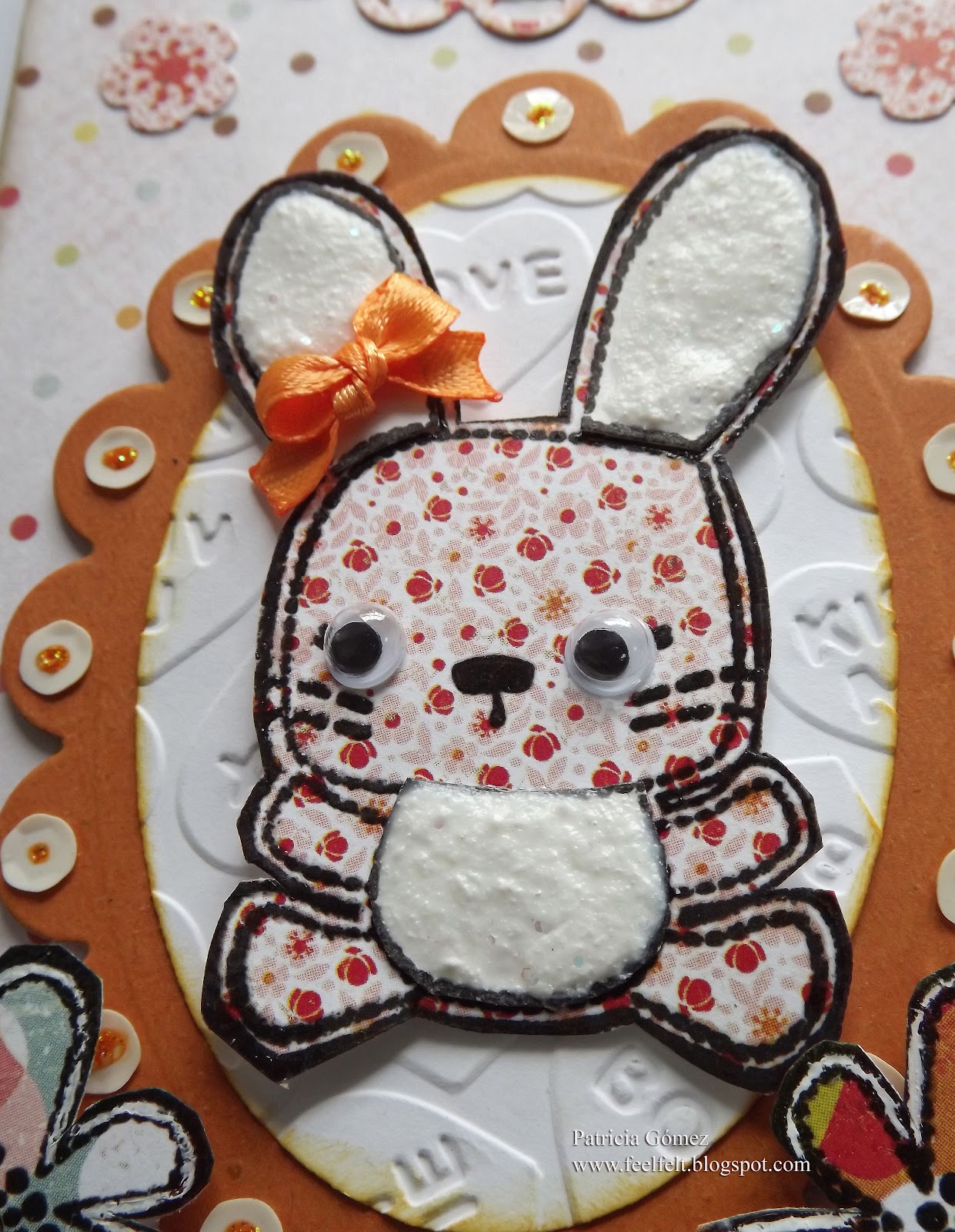La conejita es de Sandylion Baby Girl stamps, realizada mediante paperpiecing, con ojitos móviles, y tanto las orejas como la barriga llevan Snow Liner, para darle un aspecto como de relleno de los peluches.