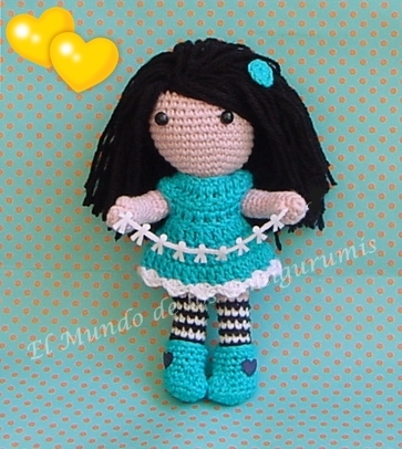 También le he hecho en color azul un pequeño corazón de ganchillo para el pelo y aquí la tenéis, a que es preciosa?....